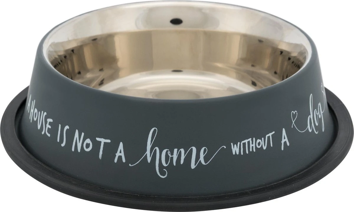 De Trixie Voerbak Hond RVS Anti Slip Grijs 700 ml is een moderne voerbak voor de hond, van RVS met print aan de buitenzijde en slipvaste ring. De grote ring zorgt ervoor dat jouw hond comfortabel kan eten zonder dat de bak door het hele huis schuift. Deze voerbak is uitgevoerd in donkergrijs met in witte letters de opdruk ‘A house is not a home without a dog’. De binnenkant van de voerbak is van glad RVS en daardoor gemakkelijk schoon te maken.